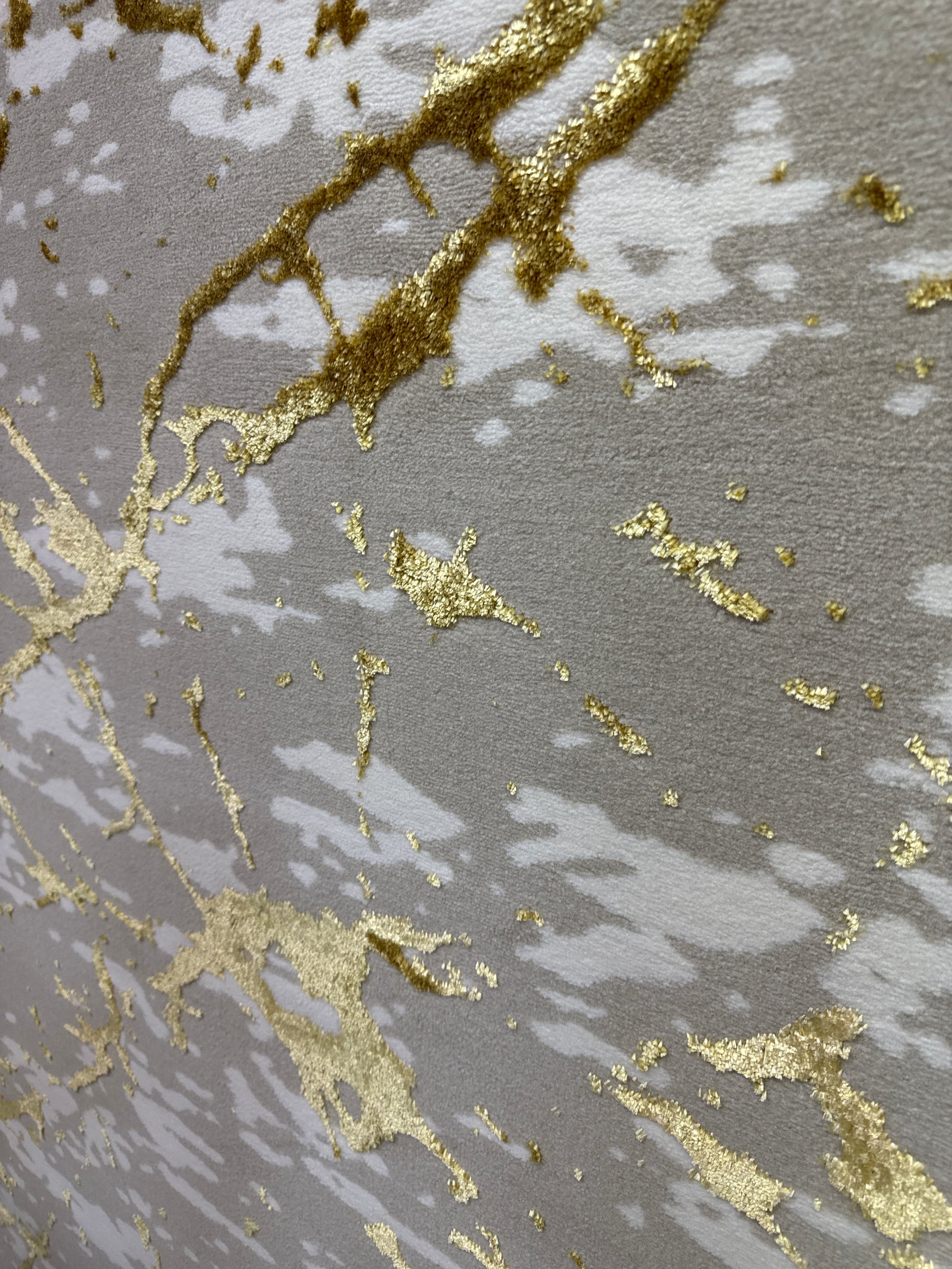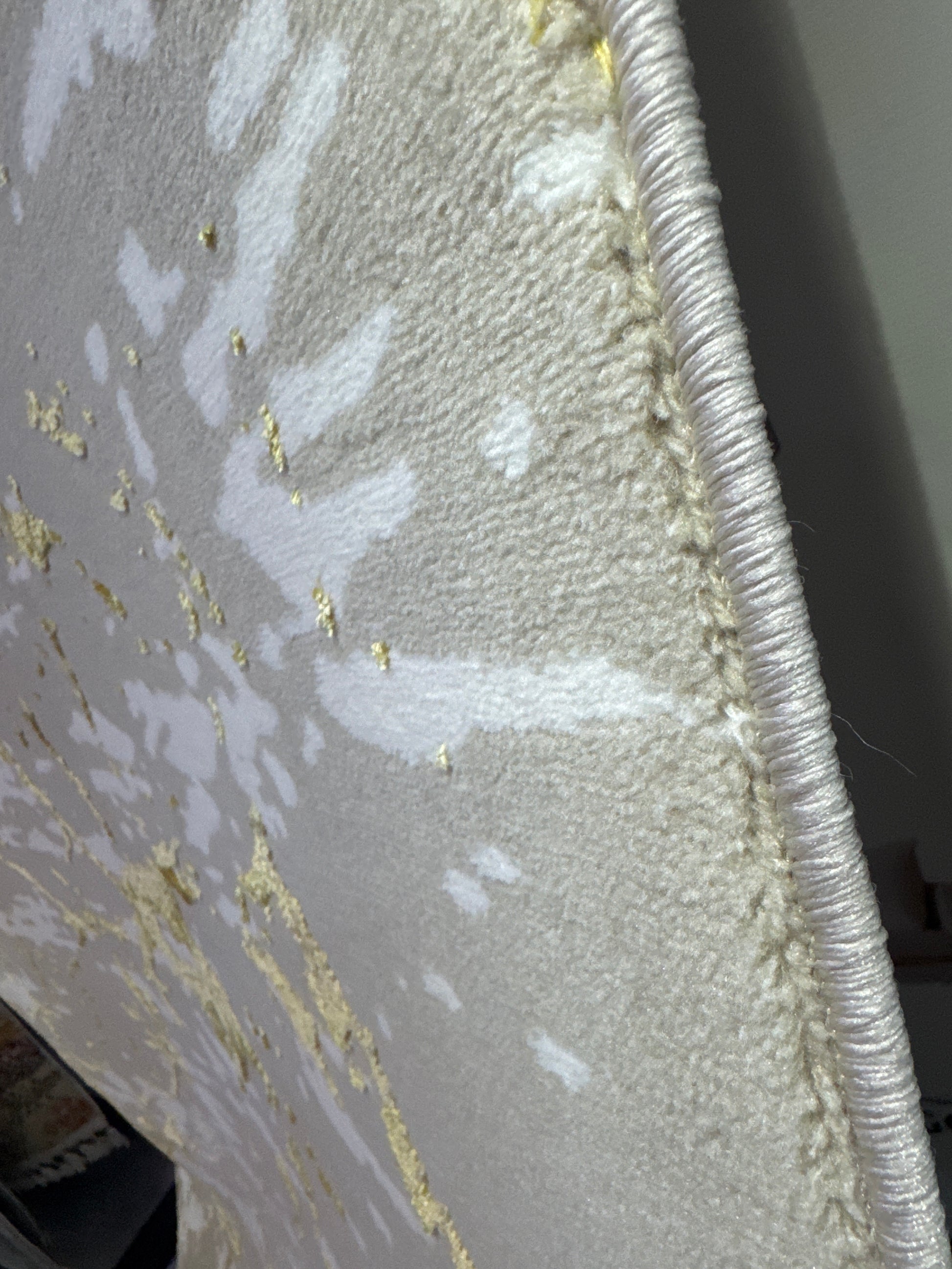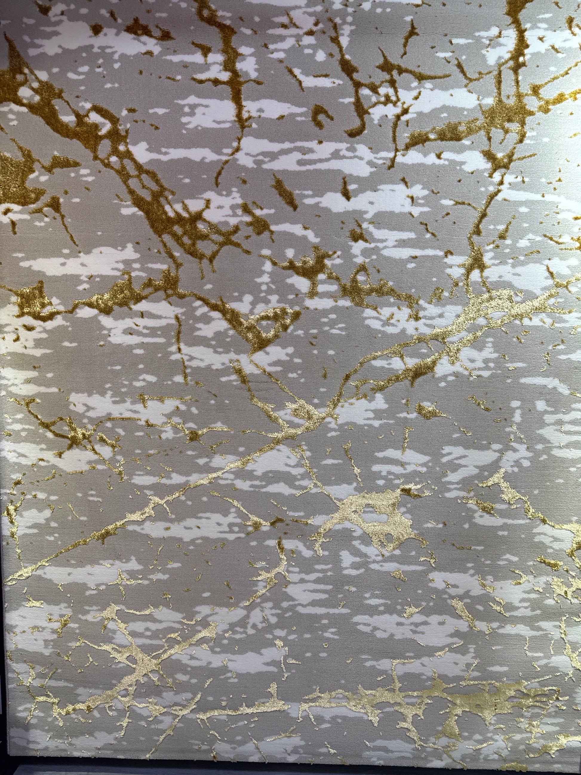Alfombra importada de Turquía con fondo gris y realces en plateado y azul, distribuida en manchas. Diseño recomendado para muebles en colores medios y oscuros como azules, grises, blancos y cremas. Solicita el video por nuestro WhatsApp.