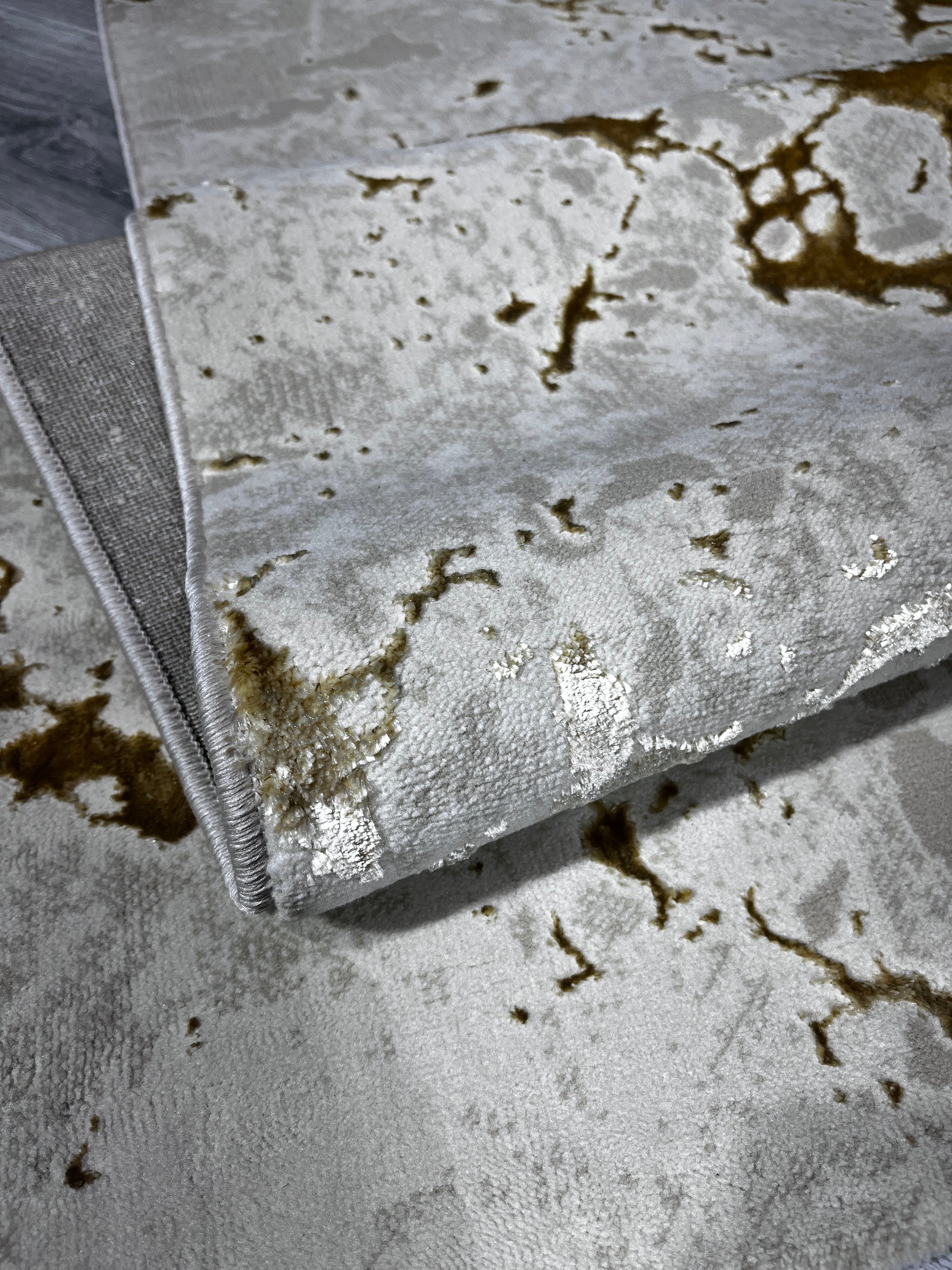 Alfombra turca colección aspendos base sisal y tejido en seda poliester, amigable con mascotas, fácil mantenimiento, anti alérgica, en colores beige y taupe con tonos claros y oscuros y realces en hilos dorados, con un estilo en abstracto ideal con muebles de todo estilo en ambientes amplios y reducidos