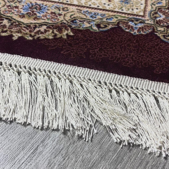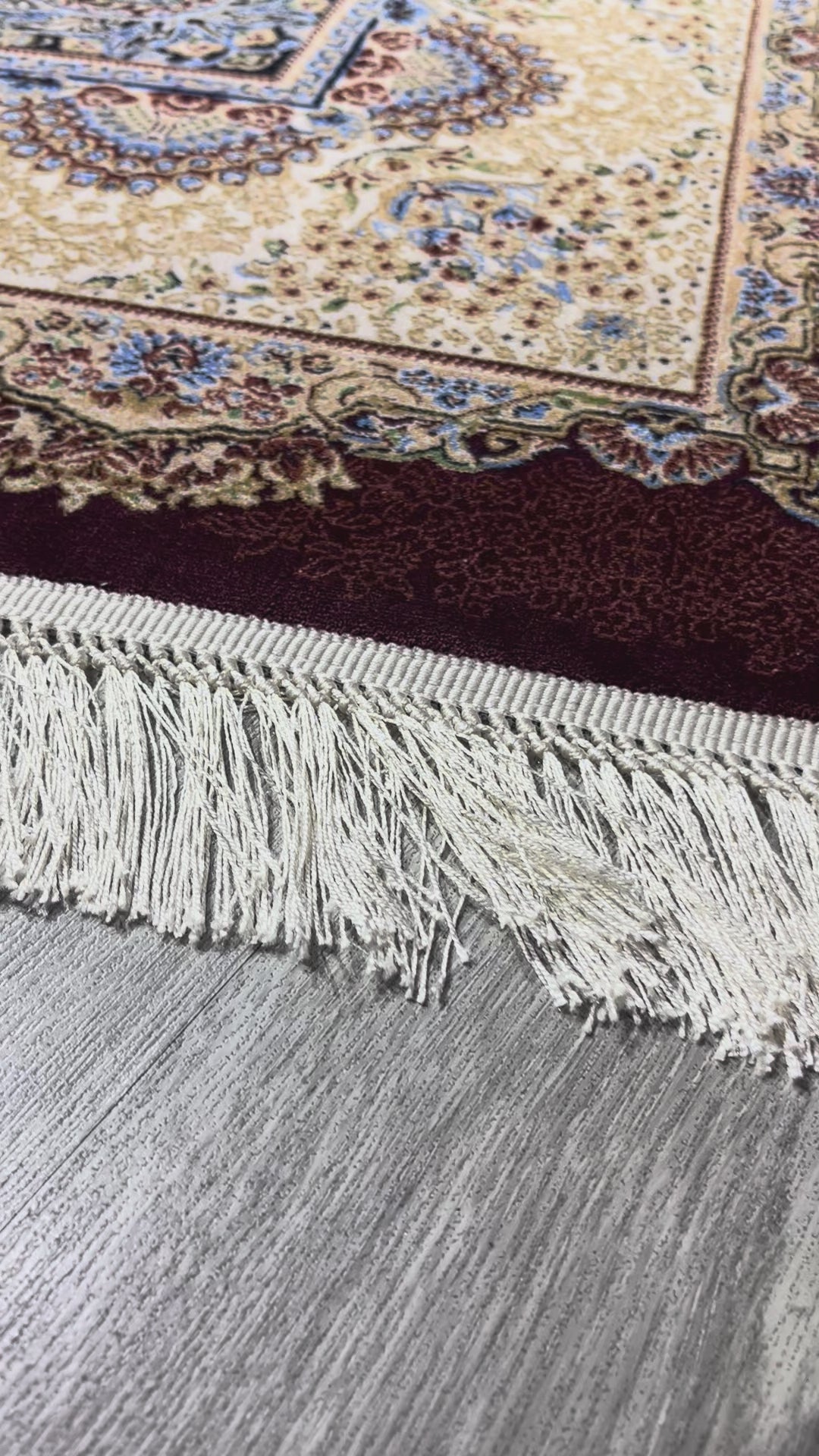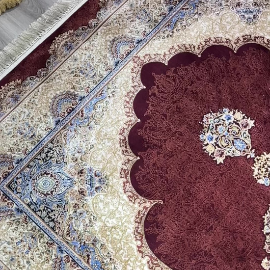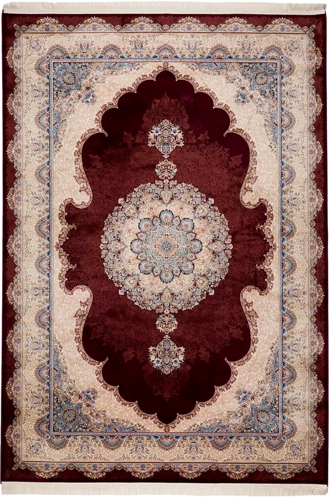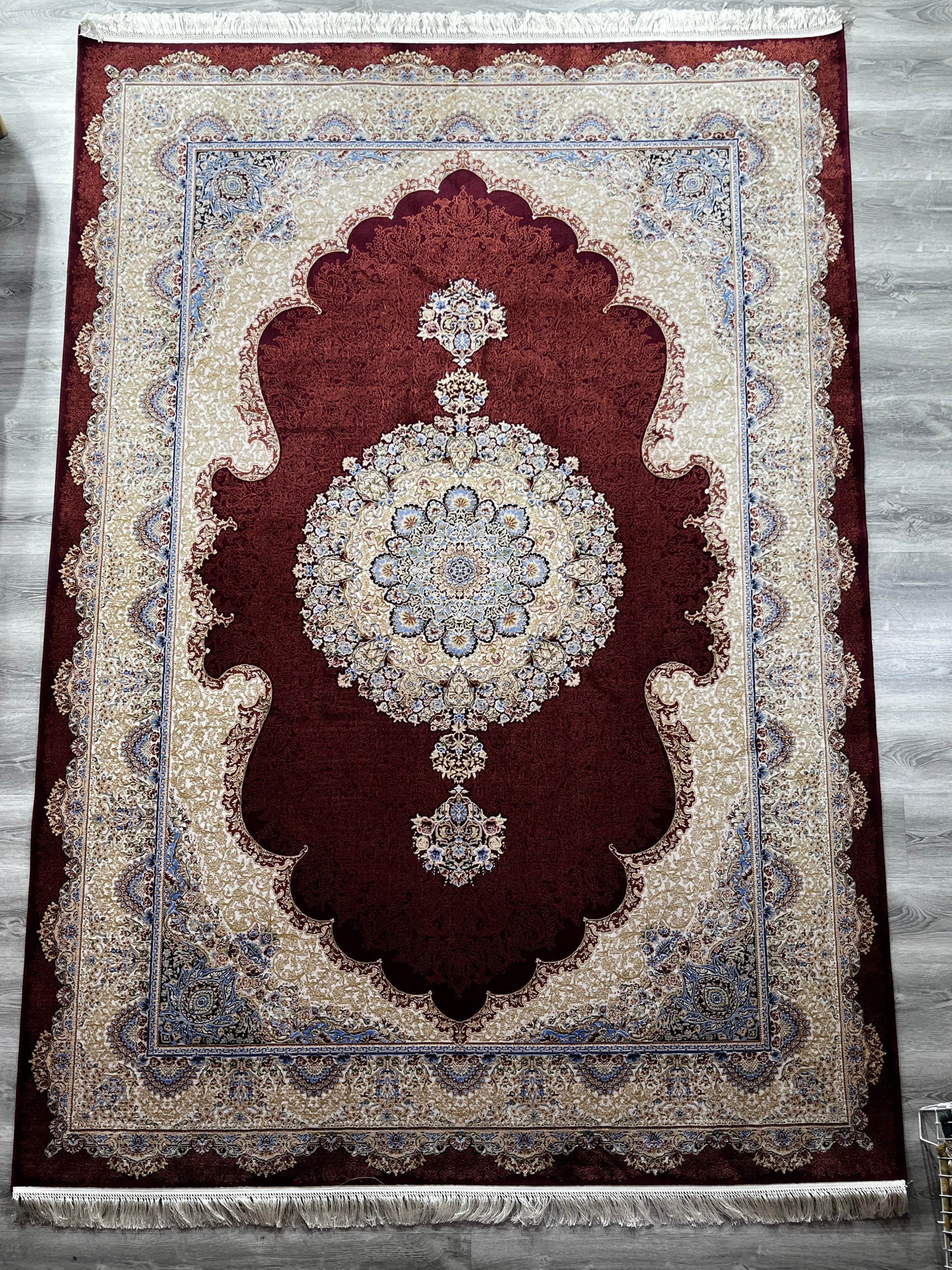 Alfombra importada de Turquía, colección Anatolia Clásica Fondo en rojo vino con medallón en bases neutras y acabados de brillos naturales, materiales terciopelo, seda fría y algodón, colección premium, garantía verificada de doce meses, fácil mantenimiento, antialérgica, anti rasguños, medida disponible 200x300 cm